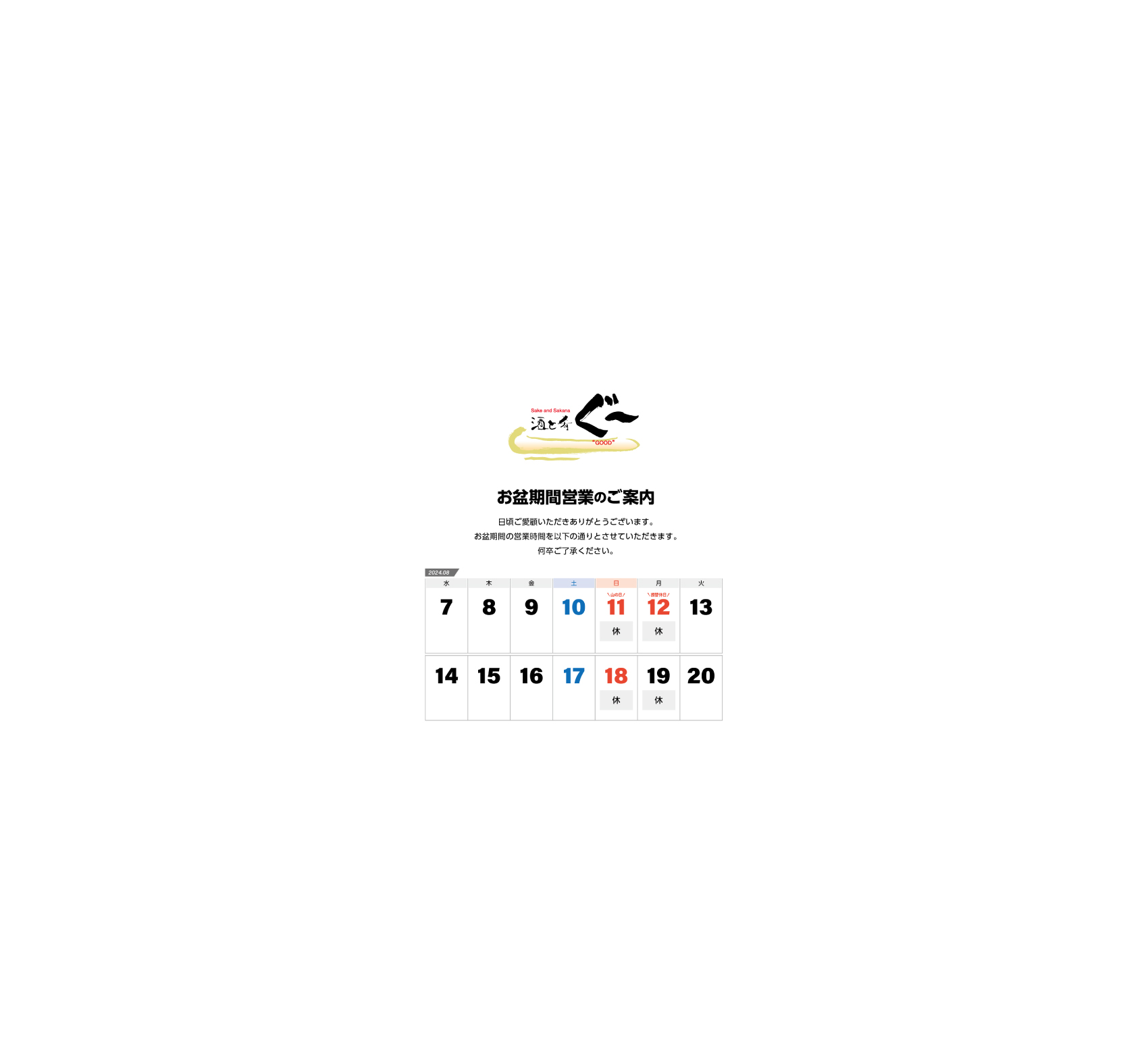 8月の祝日「山の日」付近や、お盆期間を含むカレンダーをご用意いたしました。